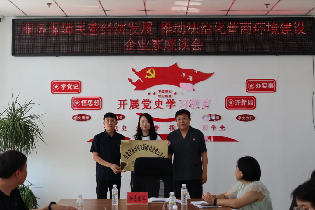 会上,法院工作人员将《中华人民共和国民营经济促进法》制成宣传册发给企业代表,赵红雨带领大家进行了深入学习,并深度解读了此部法律颁布的背景、意义和目的。法院、工商联负责同志为两家企业授予优化营商环境互通联动示范点的牌匾,并向与会企业代表发放了《关于服务保障民营经济发展 推动法治营商环境建设协调联动工作实施方案》,通过建立完善联席会议、日常联络协作、投诉诉求转送、诉调对接、联合普法宣传培训等多项沟通联系机制,架起了一座服务民营经济发展的“连心桥”。